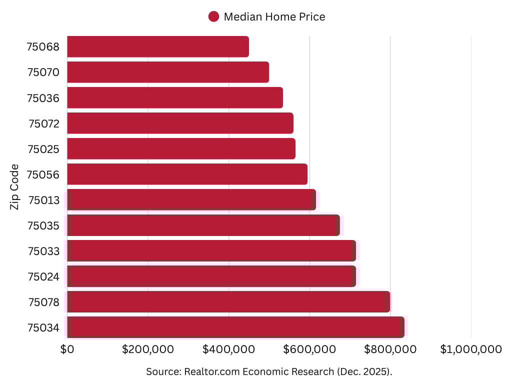 75068 still has entry points in the mid-$400Ks. Meanwhile, 75034 and 75078 (think: The Star, PGA Frisco, the newer luxury developments) are pushing well past $800K. Same city, very different mortgage payments.